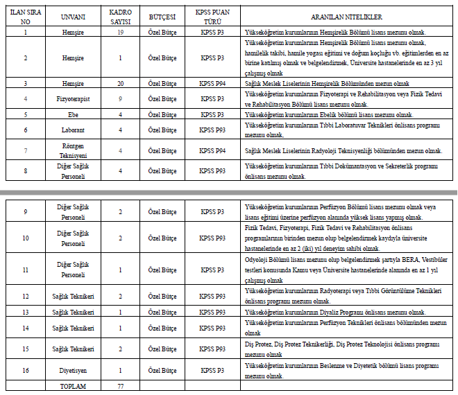 Afyonkarahisar Sağlık Bilimleri Üniversitesi Sağlık Uygulama ve Araştırma Merkezi'ne 657 dayılı Devlet Memurları Kanununun 4. maddesinin (B) fıkrasına göre istihdam edilmek üzere 06.06.1978 tarihli ve 7/15754 sayılı Kararnameye ekli 28.06.2007 tarihli ve 26566 sayılı Resmi Gazete'de yayımlanan Sözleşmeli Personel Çalıştırılmasına İlişkin Esaslarda Değişiklik Yapılmasına Dair Esaslar'da yer alan ek 2'nci maddenin (b) fıkrasına göre aşağıda belirtilen pozisyonlara giderleri özel bütçe ve döner sermaye gelirlerinden karşılanmak üzere sözleşmeli personel alınacaktır.