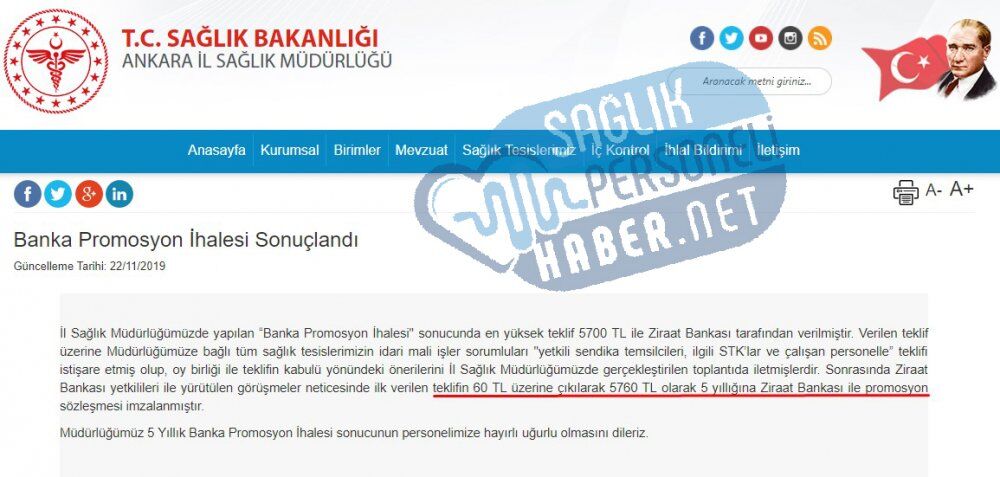 İl Sağlık Müdürlüğümüzde yapılan “Banka Promosyon İhalesi" sonucunda en yüksek teklif 5700 TL ile Ziraat Bankası tarafından verilmiştir. Verilen teklif üzerine Müdürlüğümüze bağlı tüm sağlık tesislerimizin idari mali işler sorumluları "yetkili sendika temsilcileri, ilgili STK’lar ve çalışan personelle” teklifi istişare etmiş olup, oy birliği ile teklifin kabulü yönündeki önerilerini İl Sağlık Müdürlüğümüzde gerçekleştirilen toplantıda iletmişlerdir. Sonrasında Ziraat Bankası yetkilileri ile yürütülen görüşmeler neticesinde ilk verilen teklifin 60 TL üzerine çıkılarak 5760 TL olarak 5 yıllığına Ziraat Bankası ile promosyon sözleşmesi imzalanmıştır.