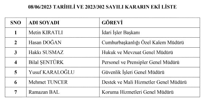 Cumhurbaşkanlığı'nda önemli atama kararları ardı ardına açıklandı. Metin KIRATLI, Cumhurbaşkanlığı İdari İşler Başkanı olarak görevine yeniden atandı. Ayrıca, Hasan Doğan Özel Kalem Müdürü olarak, Hakkı Susmaz Hukuk ve Mevzuat Genel Sekreteri olarak, ve Bilal Şentürk de Personel ve Prensipler Genel Müdürü olarak atandı. Bu atamaların ayrıntıları Resmi Gazete'de yayımlandı.