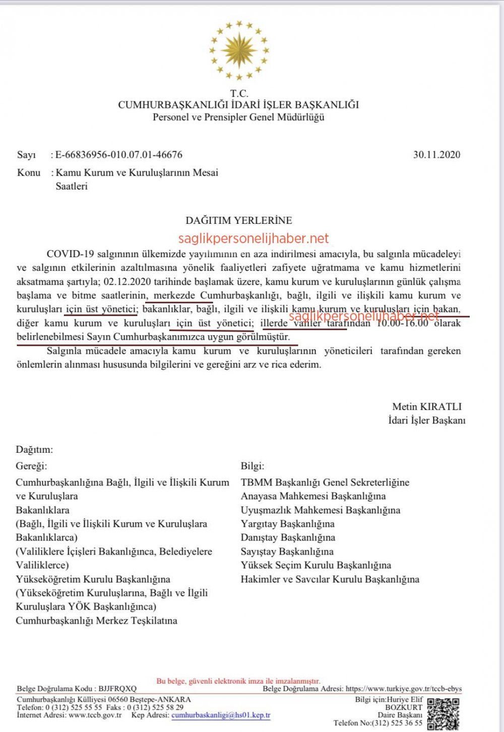 Cumhurbaşkanlığı Personel ve Prensipler Genel Müdürlüğü, kamu personelinin mesai saatlerine ilişkin resmi yazıyı yayımladı. Yazıda, 10:00 ila 16:00 arasında uygulanacak mesai saatlerinin; üst yöneticiler, bakanlar ve valiler tarafından belirleneceği belirtildi.