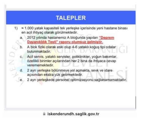 İskenderun Devlet Hastanesi’nin resmi internet sitesinin ‘Kurumsal’ bölümünde ‘Hastane Tanıtım Sunumu’ kısmında son sayfa olan 46’ıncı sayfasında ‘Talepler’ başlığında 1000 yataklı tek yerleşkede yeni bir hastane binasına acil ihtiyaç olduğu, 2012 yılında hastanenin A Blok’unda yapılan ‘Deprem Dayanıklılık Testi’ raporunun olumsuz geldiği yazıyor. A bloğun fiziki olarak eski olup 4-6 yataklı koğuş tipi odaların bulunduğu, acil servis, yataklı servisler, poliklinikler, yoğun bakımlar, özellikli birimler açılarından her iki bina da ihtiyaca cevap verilmediği bilgisi yer alıyor. Talepler başlığında 2 ayrı yerleşkenin bölünmeye yol açtığı, sevk ve idare açısından ekstra yük getirdiği, iki ayrı yerleşkede personel optimizasyonunun sağlanamadığı belirtiliyor. Bina ile ilgili 2012’de yaptırılan ‘Deprem Dayanıklılık Testi’ sonucunun olumsuz olduğu paylaşılıyor. Rapor sonuç bilgisine hastanenin internet sitesinde yer veriliyor. İskenderun Devlet Hastanesi resmi web sitesinde sunum dosyasının güncellenme tarihi 7 Nisan 2022 olarak yer alıyor. 6 Şubat’taki deprem felaketinde A Blok yıkıldı. Arama kurtarma çalışmalarında gecikme yaşanıldığı iddia edilen hastane enkazından sağlıkçıların ve hastaların cenazelerinin çıkartıldığı bilgisine ulaşıldı.