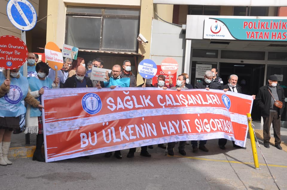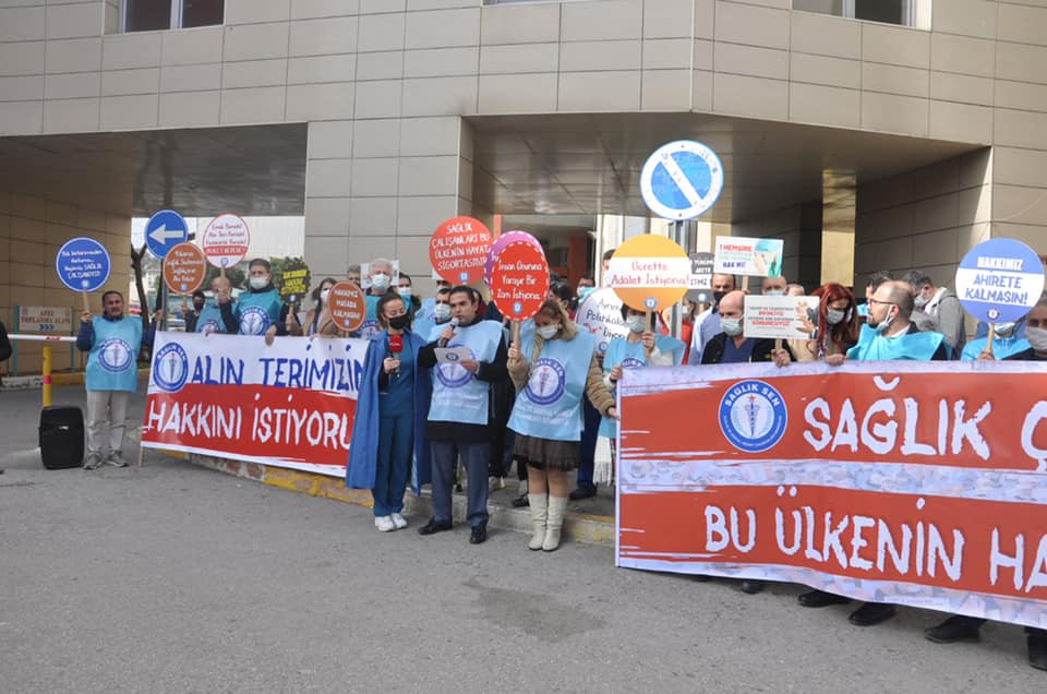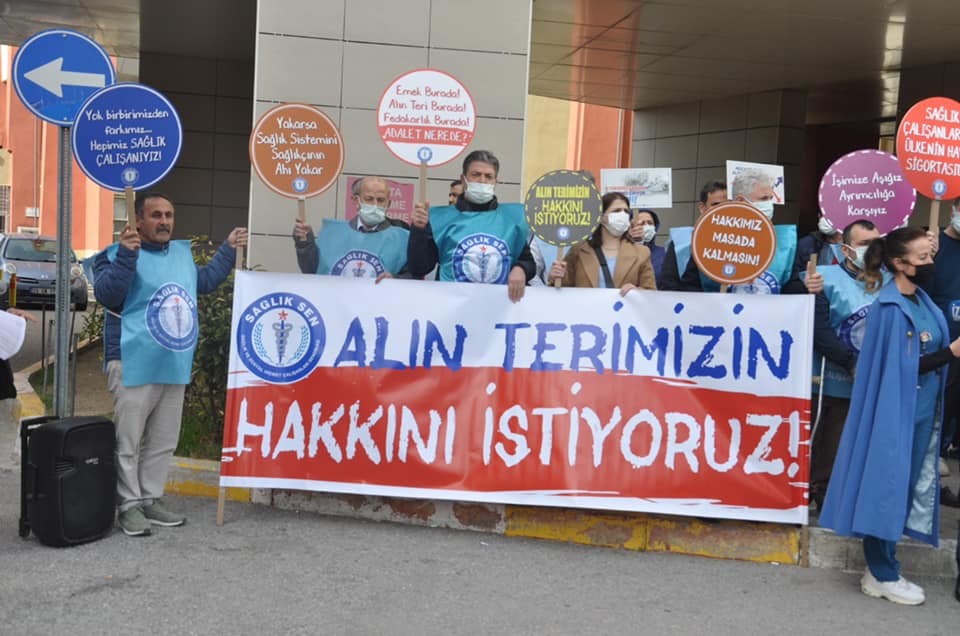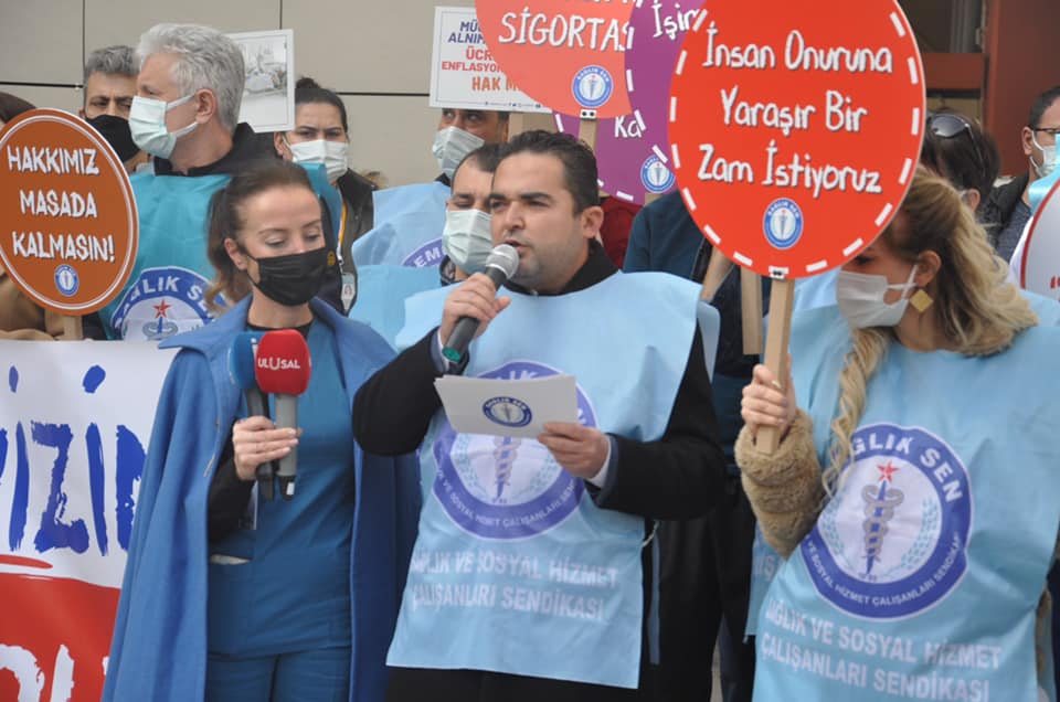 Sağlık çalışanlar verilmesi planlanan zamlarla ilgili Atatürk Eğitim ve Araştırma Hastanesi önünde basın açıklaması yapan Sağlık-Sen İzmir 2 Nolu Şube Başkanı Ekrem Özdemir, “1 Aralık 2021 Çarşamba günü, gündeme bir haber düştü… Hükümet, hekimlere 2 bin 500 ile 5 bin TL aralığında zam verileceğini ve konuyla ilgili yasal düzenlemenin aynı gün Meclise geleceğini açıkladı. Ülkenin içinde bulunduğu ekonomik koşullar dikkate alındığında, Hükümetin zam haberinden herkesin memnuniyet duyması gerekir değil mi? Ülkemizin ekonomik olarak sıkıntı çektiği bu günlerde, hem pandemi nedeni ile ön saflarda yer alıp, hem de yıllarca uygulanan sağlık alanındaki mali politikalardan dolayı eriyen ücretlerimizle mücadele ettik. Hal bu ki sağlıkta dönüşümde ve pandemi de adımızı tüm dünyaya duyuran biz sağlık çalışanları olarak hak ettiğimiz ücret verilmemektedir.