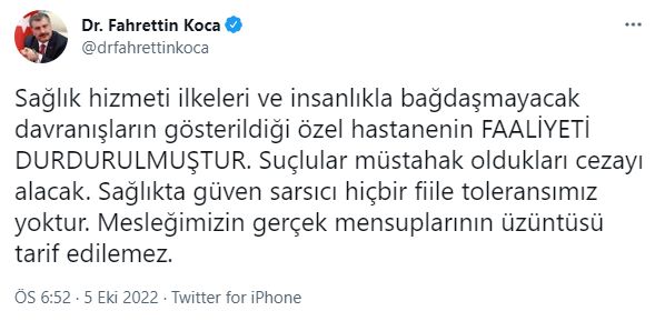"Sağlık hizmeti ilkeleri ve insanlıkla bağdaşmayacak davranışların gösterildiği özel hastanenin faaliyeti durdurulmuştur. Suçlular müstahak oldukları cezayı alacak. Sağlıkta güven sarsıcı hiçbir fiile toleransımız yoktur. Mesleğimizin gerçek mensuplarının üzüntüsü tarif edilemez."