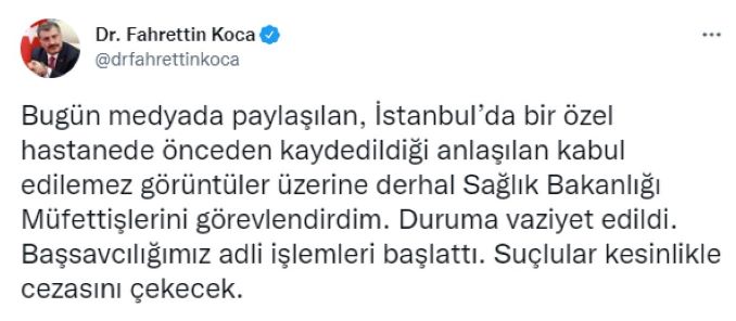 “Önceden kaydedildiği anlaşılan kabul edilemez görüntüler üzerine Sağlık Bakanlığı müfettişlerinin görevlendirdim” diyen Fahrettin Koca “duruma vaziyet edildi. Başsavcılığımız adli işlemleri başlattı. Suçlular kesinlikle cezasını çekecek” ifadelerini kullandı.