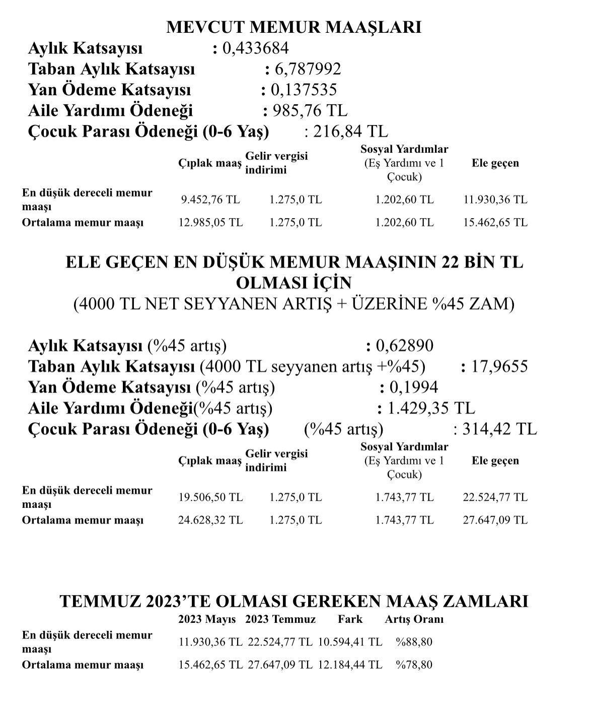 Mayıs ayı başında ortalama dolar kuru 19 TL dolayında bulunmaktaydı. Buna göre 22 bin TL olacak en düşük memur maaşı 1158 dolar civarına yükselecekti. Şimdi ise dolar kuru 23,4 TL düzeyindedir. Buna göre 22 bin TL olacak en düşük memur maaşı da 940 dolara denk gelecektir. Kaldı ki, döviz kurundaki bu artış bütün harcama kalemlerinin fiyatına da fazlasıyla yansıyacak, dolayısıyla memurun alım gücünde bir iyileşme olmayacaktır.