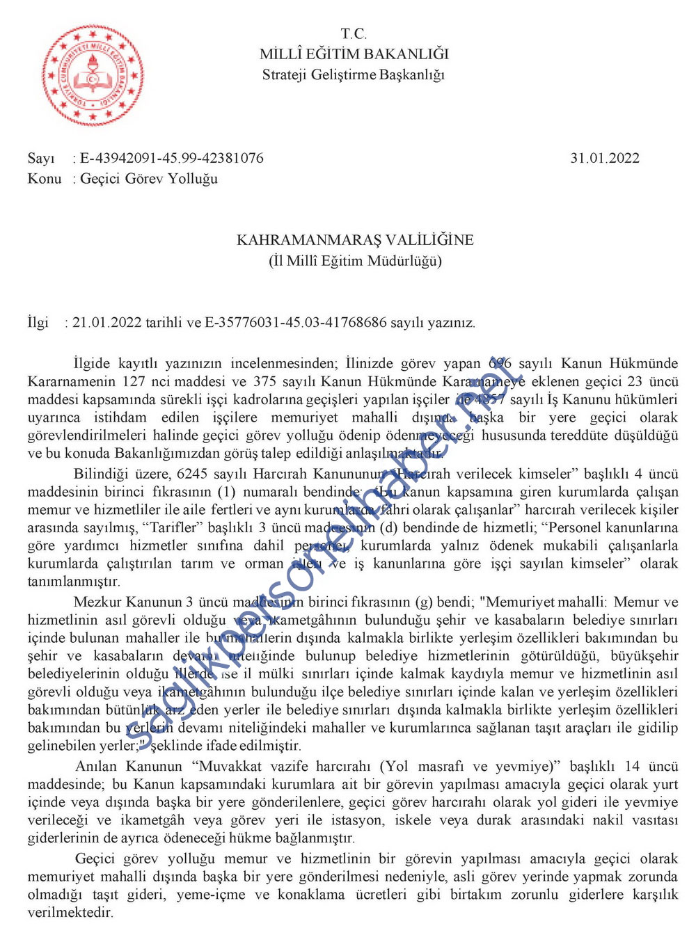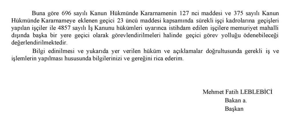 “Buna göre 696 sayılı Kanun Hükmünde Kararnamenin 127 nci maddesi ve 375 sayılı Kanun Hükmünde Kararnameye eklenen geçici 23 üncü maddesi kapsamında sürekli işçi kadrolarına geçişleri yapılan işçiler ile 4857 sayılı İş Kanunu hükümleri uyarınca istihdam edilen işçilere memuriyet mahalli dışında başka bir yere geçici olarak görevlendirilmeleri halinde geçici görev yolluğu ödenebileceği değerlendirilmektedir.” ifadelerine yer verildi.
