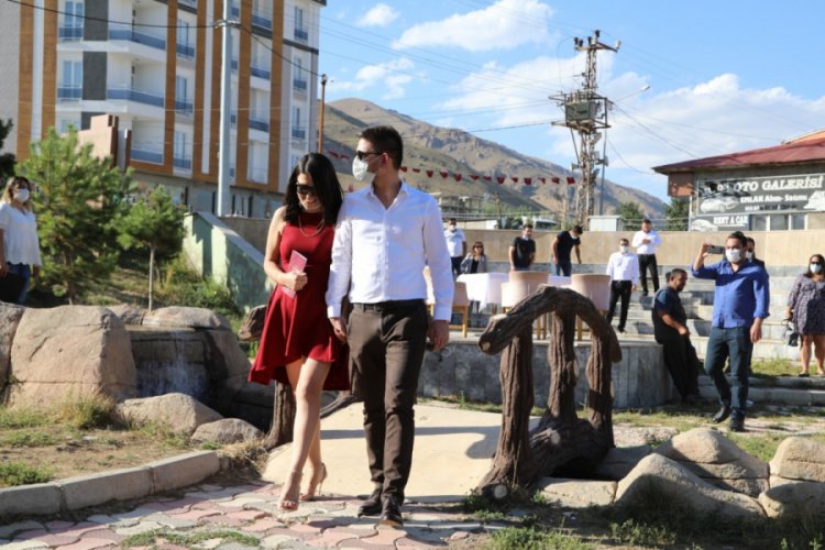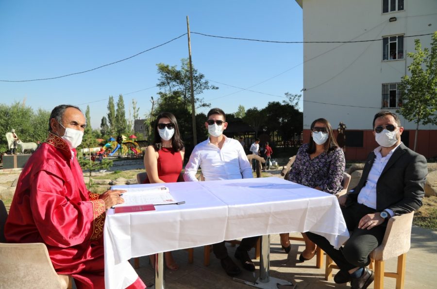 Başkale Devlet Hastanesi'nde görev yapan ve evlenme kararı alan diş hekimi Dilek Didem Kaplan ile acil doktoru Ramazan Sinsiner, 1 ay önce koronavirüsüne yakalandıklarını öğrenince nikah günlerini ertelemek zorunda kaldı. Evlerinde tedavi gören Kaplan ve Sinsiner, son yaptırdıkları testlerin sonuçları negatif çıkınca nikah masasına oturmaya karar verdi. Çiftin nikahı, belediye hizmet binasının yanındaki Şehit Korucu Cihangir Yıldız Parkı'ndaki açık havada, Başkale Belediyesi Evlendirme Memuru Necmettin Şahinoğlu tarafından kıyıldı.