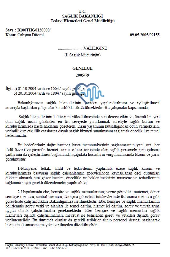 2-Uygulamada ebe, hemşire ve sağlık memurlarının; vezne görevlisi, mutemet, döner sermaye memuru, santral memuru, danışma görevlisi, tutukevlerinde üst arama memuru gibi görevlerde çalıştırıldıkları Bakanlığımıza iletilmektedir. Ebe, hemşire ve sağlık memurlarının belirlenmiş görev yetki ve alanları ile temel eğitim, hizmet içi eğitim, görev ve unvanlarına uygun olarak çalıştırılmaları gerekmektedir. Ebe, hemşire ve sağlık memurları sağlık hizmetleri dışında çalıştırılmamalı, mevzuat ile belirlenen görev ve yetkileri dışında görev verilmemelidir. Bu durumda olanlar da gerekli tedbirler alınıp personel desteği sağlanarak hizmetin aksamasına meydan verilmeden düzeltilmelidir.