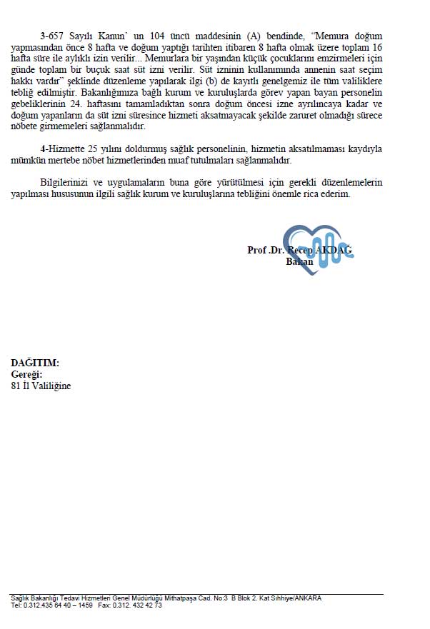3- 657 Sayılı Kanun’ un 104 üncü maddesinin (A) bendinde, “Memura doğum yapmasından önce 8 hafta ve doğum yaptığı tarihten itibaren 8 hafta olmak üzere toplam 16 hafta süre ile aylıklı izin verilir... Memurlara bir yaşından küçük çocuklarını emzirmeleri için günde toplam bir buçuk saat süt izni verilir. Süt izninin kullanımında annenin saat seçim hakkı vardır” şeklinde düzenleme yapılarak ilgi (b) de kayıtlı genelgemiz ile tüm valiliklere tebliğ edilmiştir. Bakanlığımıza bağlı kurum ve kuruluşlarda görev yapan bayan personelin gebeliklerinin 24. haftasını tamamladıktan sonra doğum öncesi izne ayrılıncaya kadar ve doğum yapanların da süt izni süresince hizmeti aksatmayacak şekilde zaruret olmadığı sürece nöbete girmemeleri sağlanmalıdır.