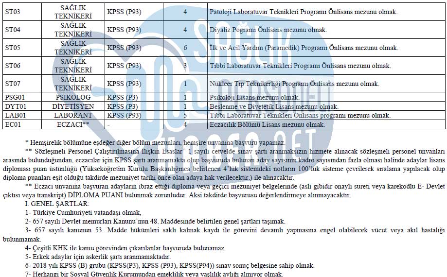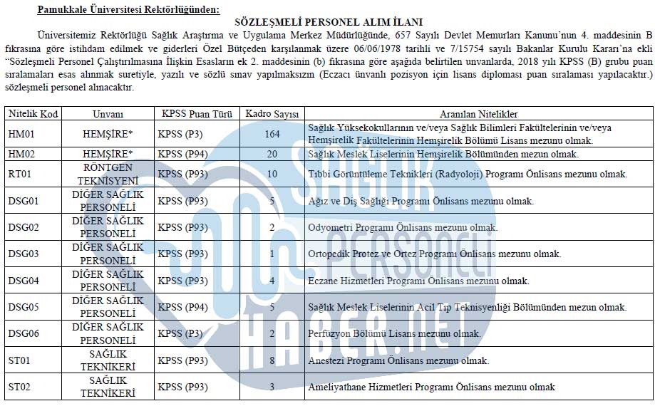 Üniversitemiz Rektörlüğü Sağlık Araştırma ve Uygulama Merkez Müdürlüğünde, 657 Sayılı Devlet Memurları Kanunu’nun 4. maddesinin B fıkrasına göre istihdam edilmek ve giderleri Özel Bütçeden karşılanmak üzere 06/06/1978 tarihli ve 7/15754 sayılı Bakanlar Kurulu Kararı’na ekli “Sözleşmeli Personel Çalıştırılmasına İlişkin Esasların ek 2. maddesinin (b) fıkrasına göre aşağıda belirtilen unvanlarda, 2018 yılı KPSS (B) grubu puan sıralamaları esas alınmak suretiyle, yazılı ve sözlü sınav yapılmaksızın (Eczacı ünvanlı pozisyon için lisans diploması puan sıralaması yapılacaktır.) sözleşmeli personel alınacaktır.