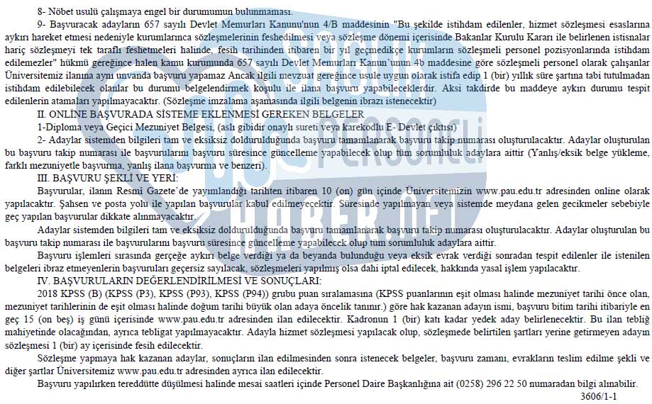 Sözleşme yapmaya hak kazanan adaylar, sonuçların ilan edilmesinden sonra istenecek belgeler, başvuru zamanı, evrakların teslim edilme şekli ve diğer şartlar Üniversitemiz www.pau.edu.tr adresinden ayrıca ilan edilecektir.