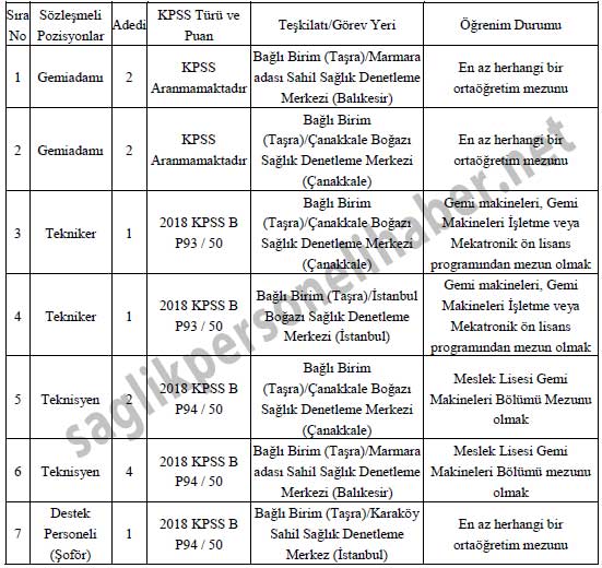 Aşağıda sözleşmeli pozisyonu, adedi, KPSS türü ve puanı, teşkilatı /görev yeri ve öğrenim durumu belirtilen, 657 sayılı Devlet Memurları Kanunu'nun 4/B maddesi kapsamında, Bakanlar Kurulunun 06 Haziran 1978 tarihli ve 7/15754 sayılı "Sözleşmeli Personel Çalıştırılmasına İlişkin Esaslar" konulu kararı çerçevesinde 13 (onüç) adet sözleşmeli personel alımı yapılacaktır. Genel Müdürlüğümüzde istihdam edilmek üzere 2 (iki) tekniker, 6 (altı) teknisyen, 4 (dört) gemi adamı ve 1 (bir) destek personeli (şoför) alınacaktır.