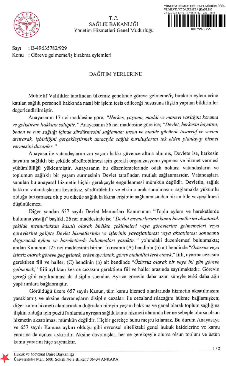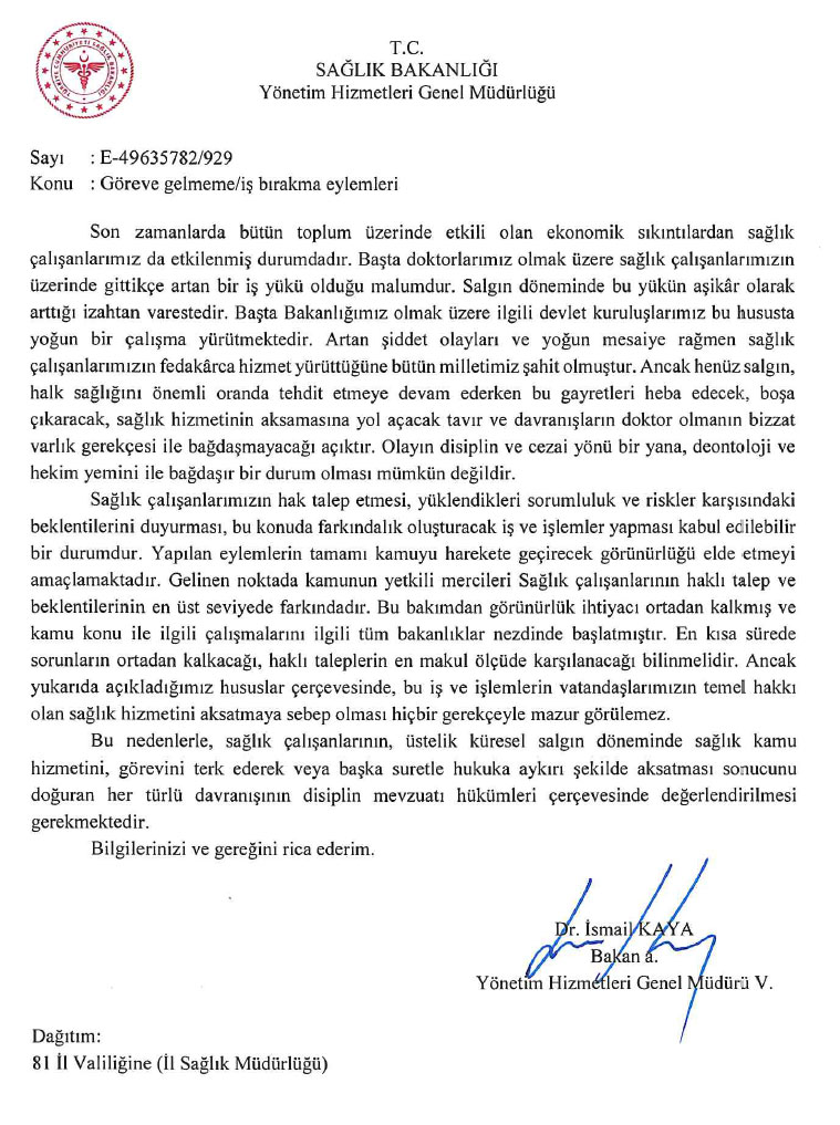 En kısa sürede sorunların ortadan kalkacağı. haklı taleplerin en makul ölçüde karşılanacağı bilinmelidir. Ancak yukarıda açıkladığımız hususlar çerçevesinde, bu iş ve işlemlerin vatandaşlarımızın temel hak, olan sağlık hizmetini aksatmaya sebep olması hiçbir gerekçeyle mazur görülemez. Bu nedenlerle sağlık çalışanlarının, üstelik küresel salgın döneminde sağlık kamu hizmetini, görevini terk ederek veya başka suretle hukuka aykırı şekilde aksatması sonucunu doğuran her türlü davranışının disiplin mevzuat’ hükümleri çerçevesinde değerlendirilmesi gerekmektedir.”