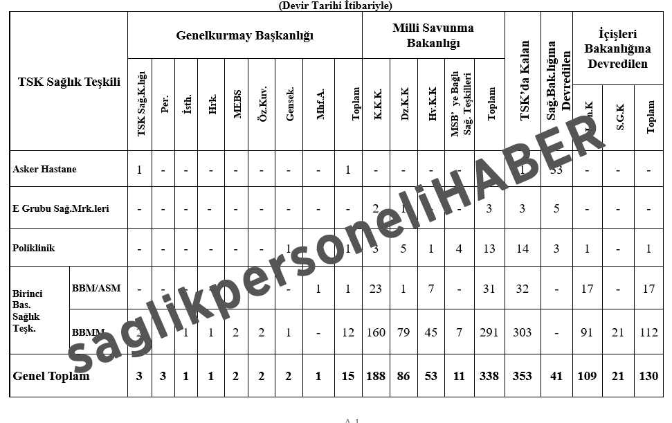 MADDE 5- (1) 6756 Sayılı Olağanüstü Hal Kapsamında Bazı Tedbirler Alınması ve Milli Savunma Üniversitesi Kurulması ile Bazı Kanunlarda Değişiklik Yapılmasına Dair Kanun Hükmünde Kararnamenin Değiştirilerek Kabul Edilmesi Hakkındaki Kanun ile Sağlık Bakanlığına devredilen sağlık teşkilleri ile Türk Silahlı Kuvvetleri bünyesinde kalan sağlık teşkillerinin, devir tarihi itibariyle mevcut durumu EK-A’da yer alan çizelgede göterilmiştir.