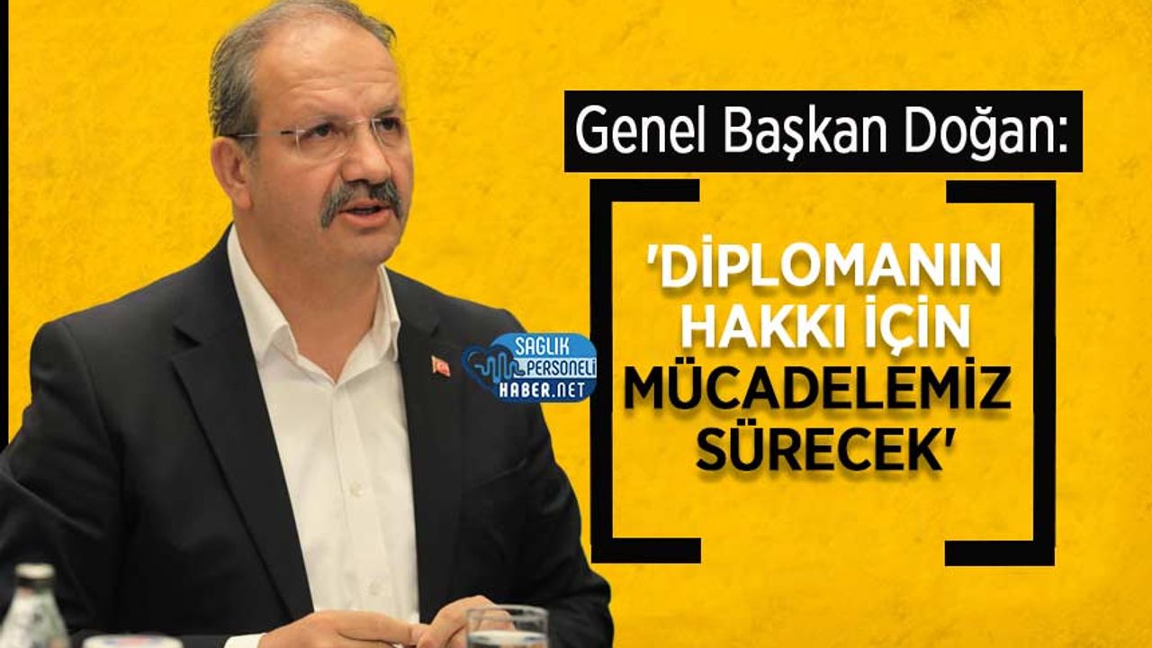 Toplantıda konuşan Genel Başkan Doğan, kamudaki maaş dengesizliklerine dikkat çekerek, “Çalışanlar arasındaki ücret farklılıkları kamu hastanelerinin koridorlarında, 112 istasyonlarında iş barışını bozuyor. Bizim kimsenin maaşında gözümüz yok, derdimiz diplomanın hakkını alabilmek” dedi.