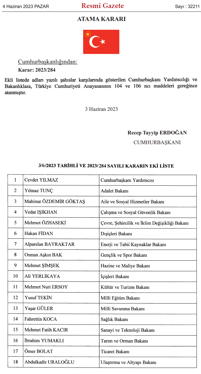 Bu önemli duyurunun ardından, resmi gazete’de yeni kabine isimlerinin yer aldığı karar yayımlandı. Böylece, Türkiye'nin yönetim kadrosu yeniden şekillendi.