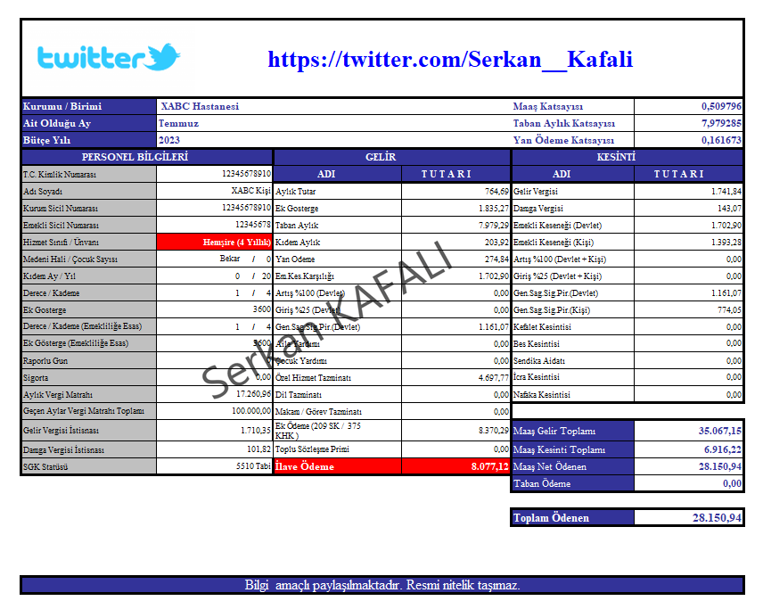 ÖNEMLİ: Maaşlar % 20 vergi dilimine göe hesaplanmış, Sendikası Baraj üstü olan personeller yukarıdaki tutarlara 1080 TL eklemelidir. Sendikası baraj altında olanlar ise 382 TL eklemelidir. Ayrıca 6 Yaş küçük çocuk 255, 6 Yaş büyük çocuk 127,50 TL ile Eşi çalışmayan 1159 TL yukarıdaki tutarlara ekleyerek net maaşını öğrenmiş olabilir.